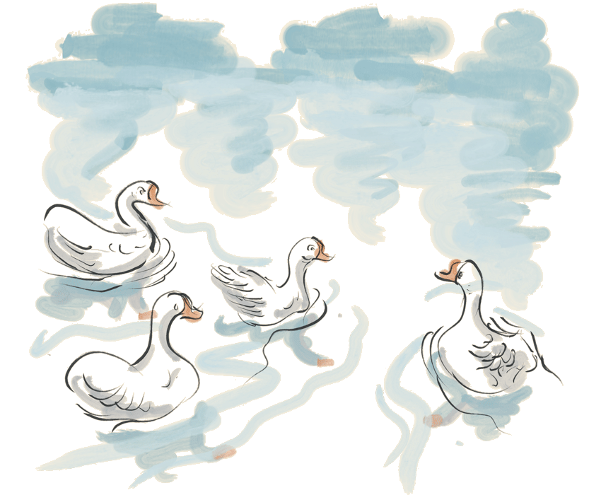 鵝的頸項又長又彎,牠們伸長脖子「哦哦哦」的叫,就像引吭高歌一般。牠們的羽毛雪白,在清澈碧綠的水面上慢慢游動,紅色的腳掌不時撥動水波,神態是那麼悠閒自得。