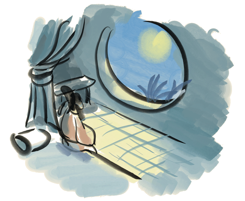 月光映照床前(解作卧床或井欄),我還以為是一層層白色的霜。抬頭凝望皎潔的月亮,低頭思念遙遠的故鄉。