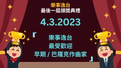 為總結節目在過往兩年多曾送上的佳餚美樂,「樂事逸台」將於本月舉辦「樂事逸台最後一屆頒獎典禮」!頒獎禮分四個星期舉行,每星期頒發一個獎項,分別是「樂事逸台最受歡迎早期/巴羅克作曲家」、「樂事逸台最受歡迎古典作曲家」,「樂事逸台最受歡迎浪漫作曲家」及「樂事逸台最受歡迎二十世紀作曲家」。屆時,你可以到「樂事逸台」的臉書專頁投選你最喜愛的主題作曲家。