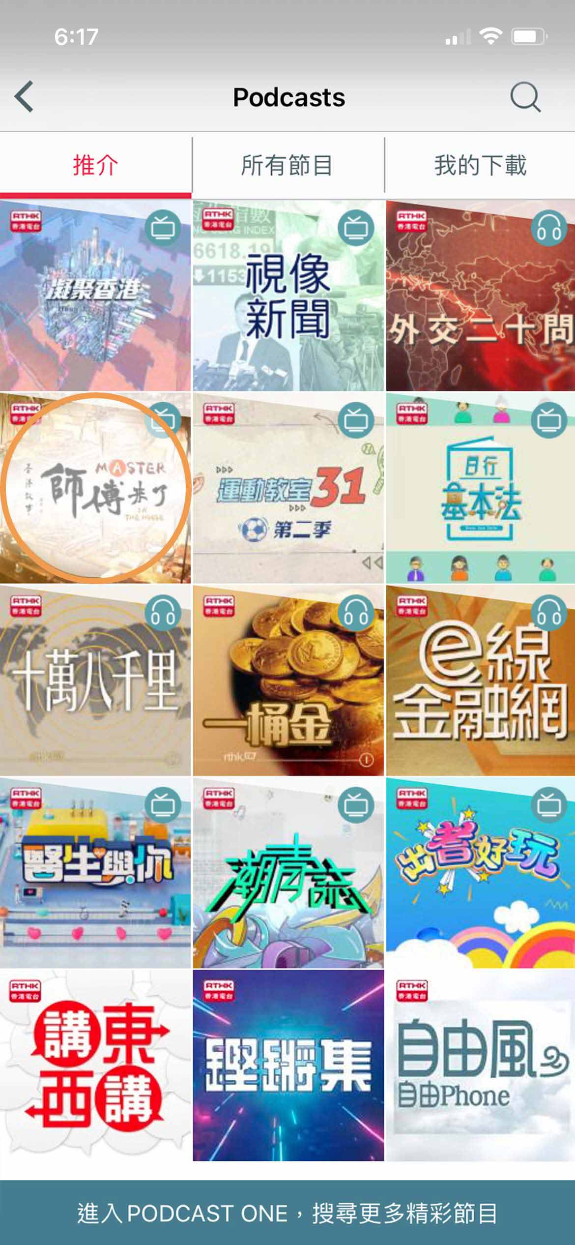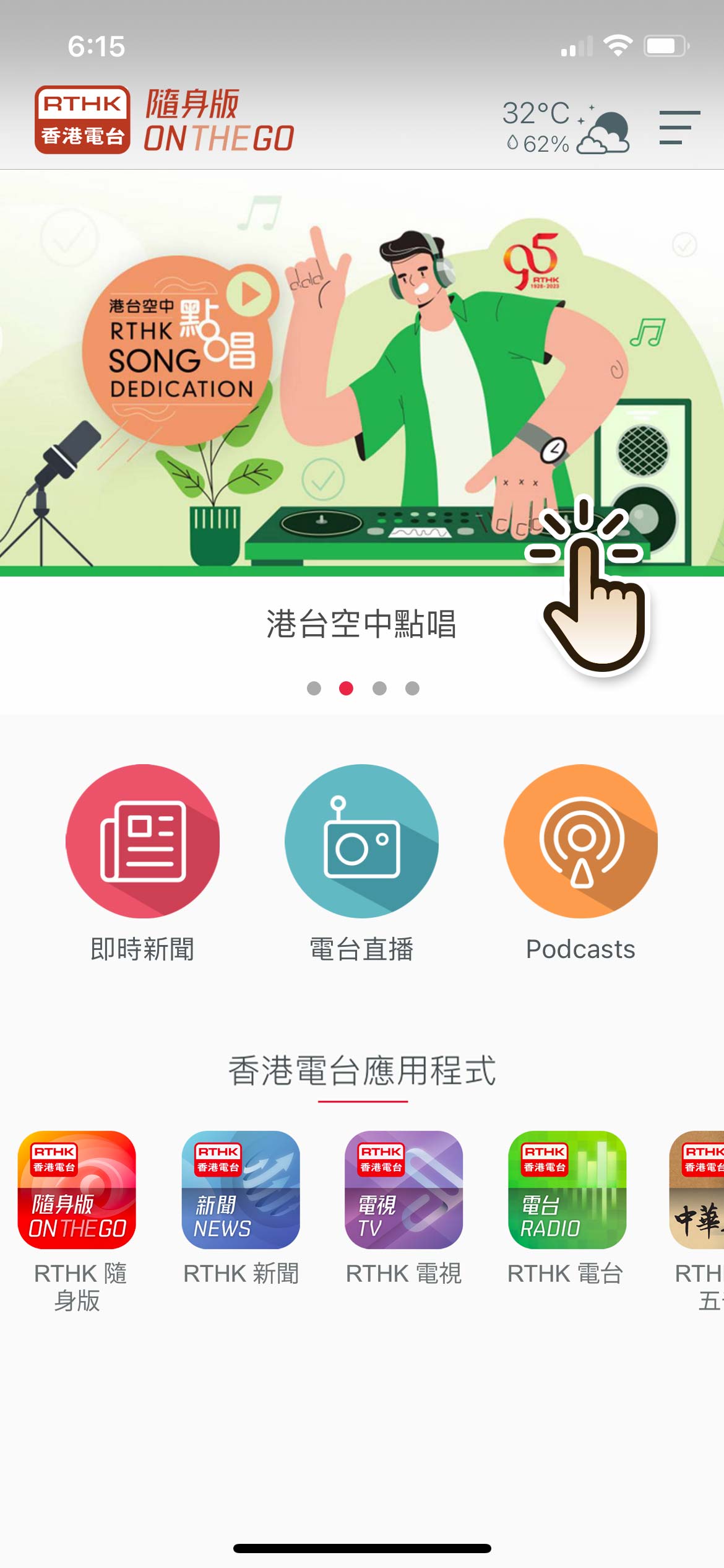 用戶在 "RTHK On The Go" 的主頁選擇「Podcasts