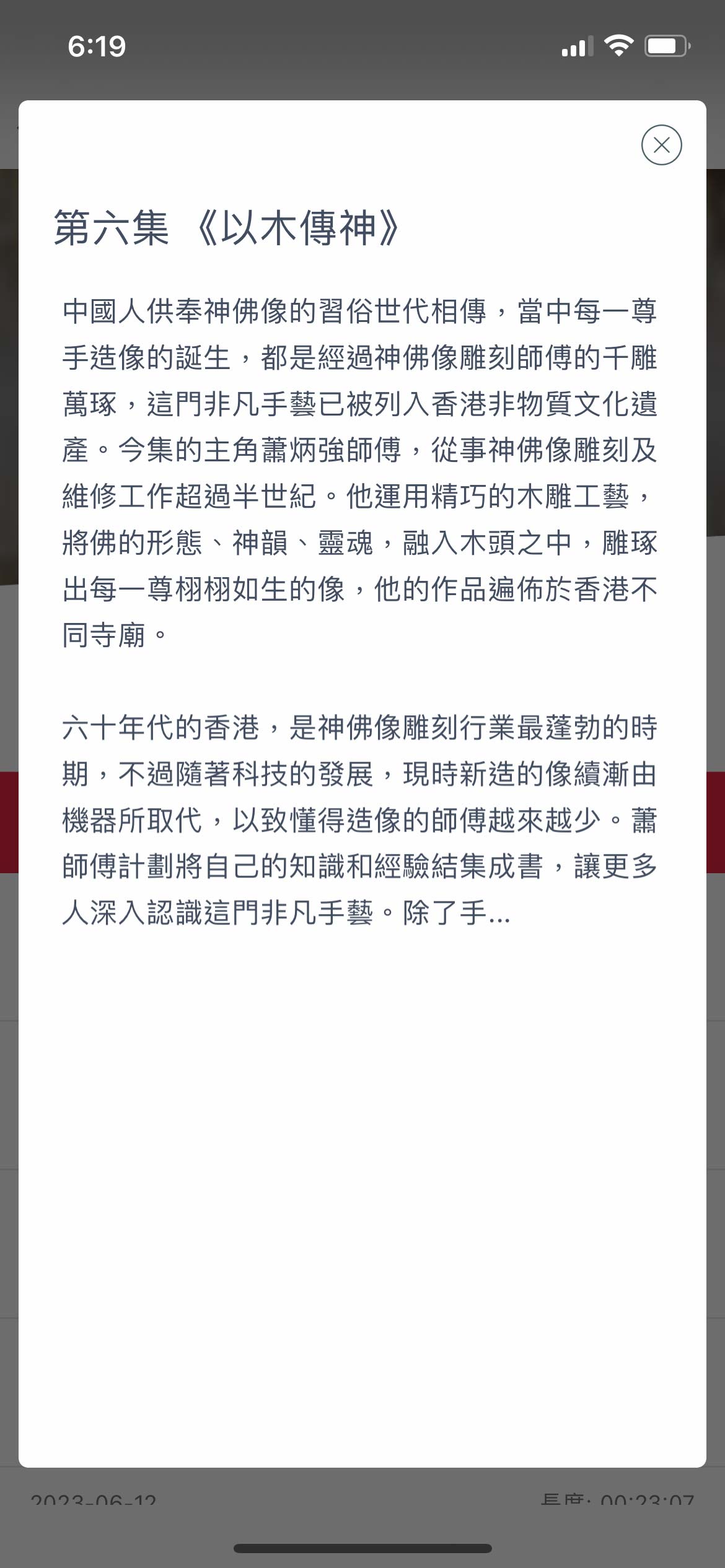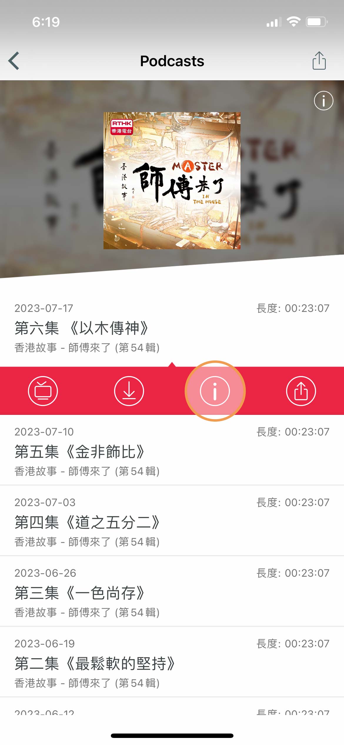 用戶選擇Podcast 節目後,程式會顯示該節目的資料簡介及最新十五集內容,用戶可點選任何一集收看或收聽。想「即時收看