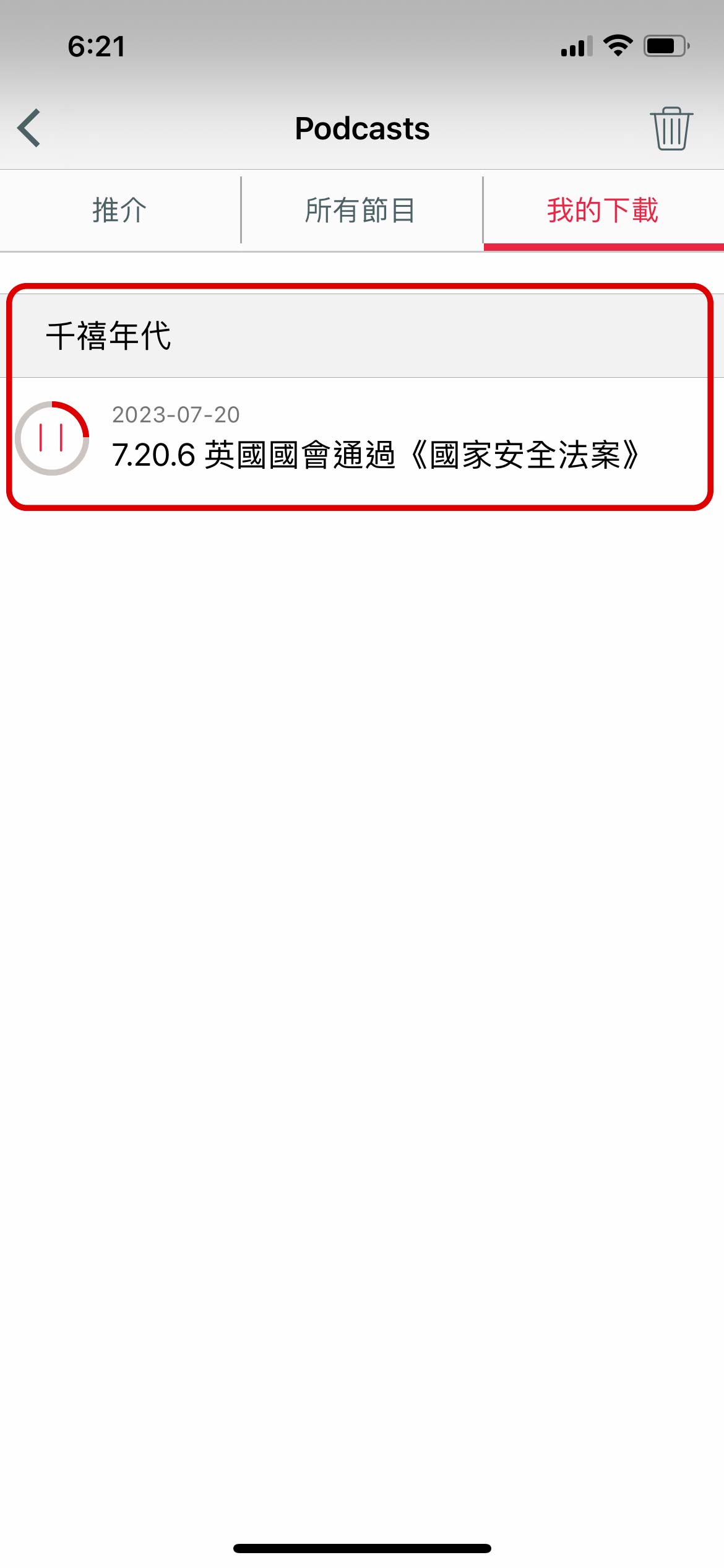 用戶在「我的下載」版面,可刪除個別 Podcast 節目內容,或一次過刪除所有節目內容。用戶亦可按右上角「垃圾桶
